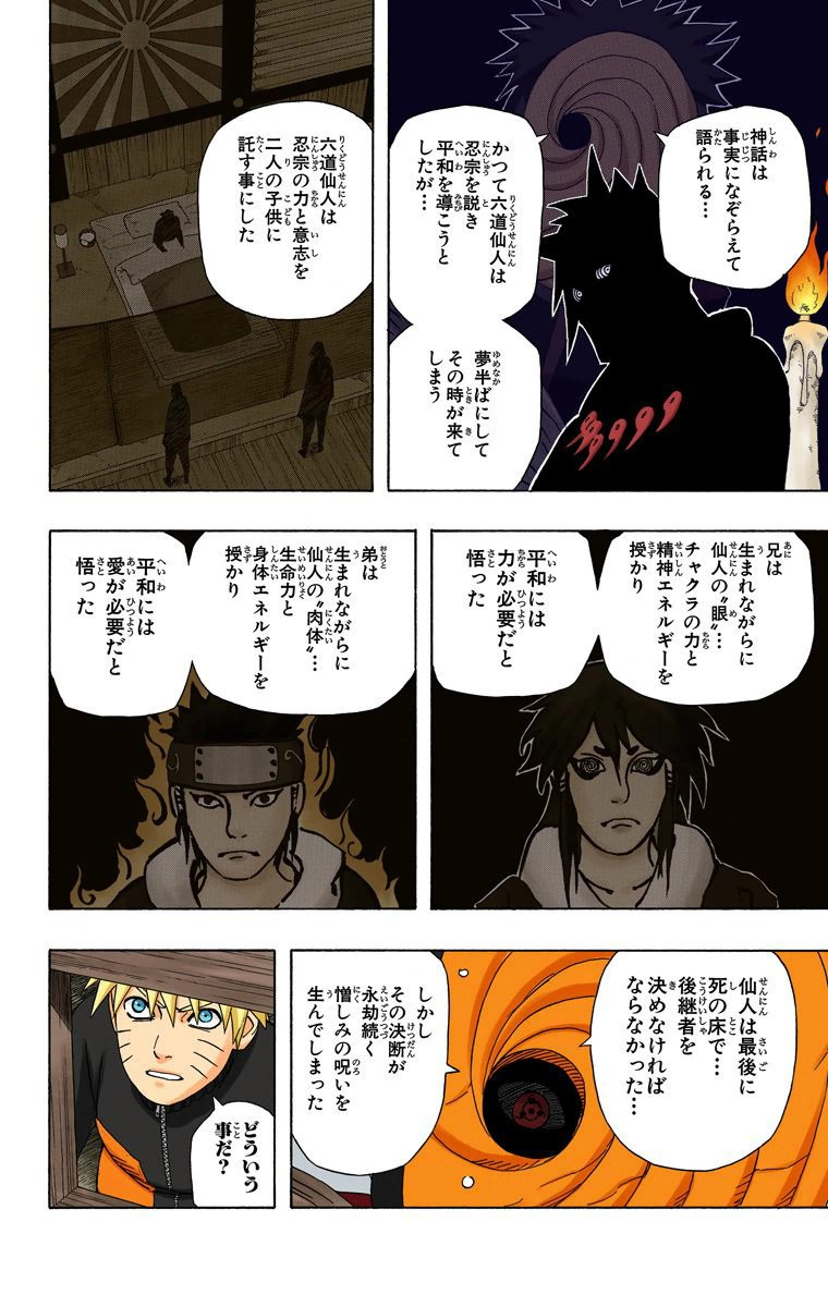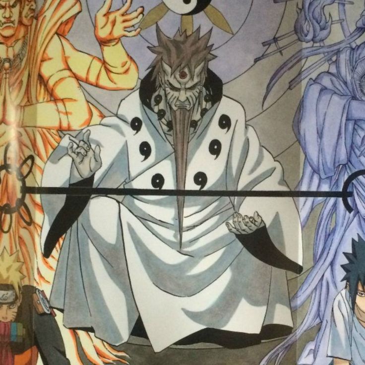 В вершине скана, справа изображён Сам Мудрец Шести Путей, Хагоромо - и у него показан Риннеган (божественные спиральные глаза).