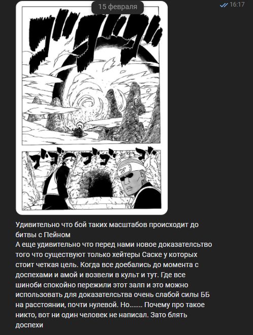А Райкаге просто дурачок. Зачем то руку отрубил. Она же не жжёт совсем. Подождал бы 7 дней, или потушил бы водой или оттолкнул чакрой. А тут сразу руку. И все дурачки какие то. Зачем то в манге защищаются от амы. Вон Фелл же опроверг, что она что-то сжигает. А дурачки от неё зачем то защищаются, а дурачок Саске с Итачи зачем то её используют. Вот и выходит. Один Фелл умный, а все остальные дураки.Или тут как то можно усидеть одновременно на двух стульях? Слушай, а почему Тобирама и Джирая настолько слабы, вот прям настолько днищенские персонажи по вашему мнению, что если не задвигать о фанфиковом аматэрасу, вы не хотите их сравнивать с Учихами без этого условия? Боитесь что если вы признаете то, что прямым текстом прописано об Аматэрасу в манге, Тобирама с Джираей совсем не вытянут Итачи или Саске? Не... ну даже я лучшего о них мнения, чем их фанаты. Это удивительно. Слушайте, если вы больше 10 лет не можете договориться по одному вопросу в манге, может быть стоит придти к выводу, что не стоит наверное обсуждать настолько противоречивую и убогую мангу как Наруто? А то у вас только Боруто там плохой и ужасный.