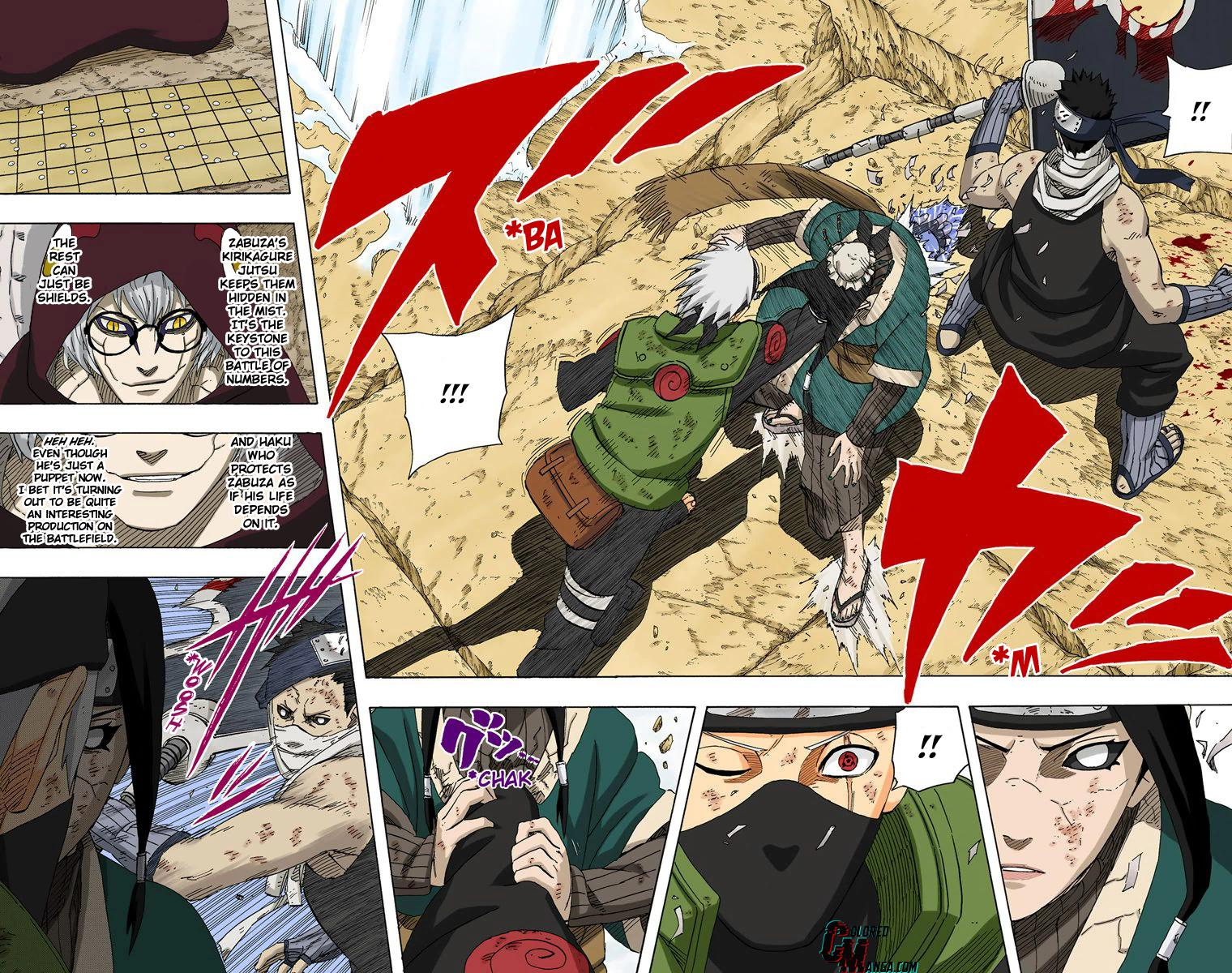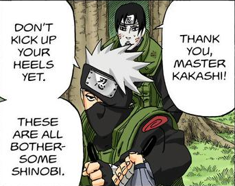Какаши признаёт Камуи недостаточным против порезанного ЭТ Хаку и призывает всех быть начеку (а то есть работать сообща).