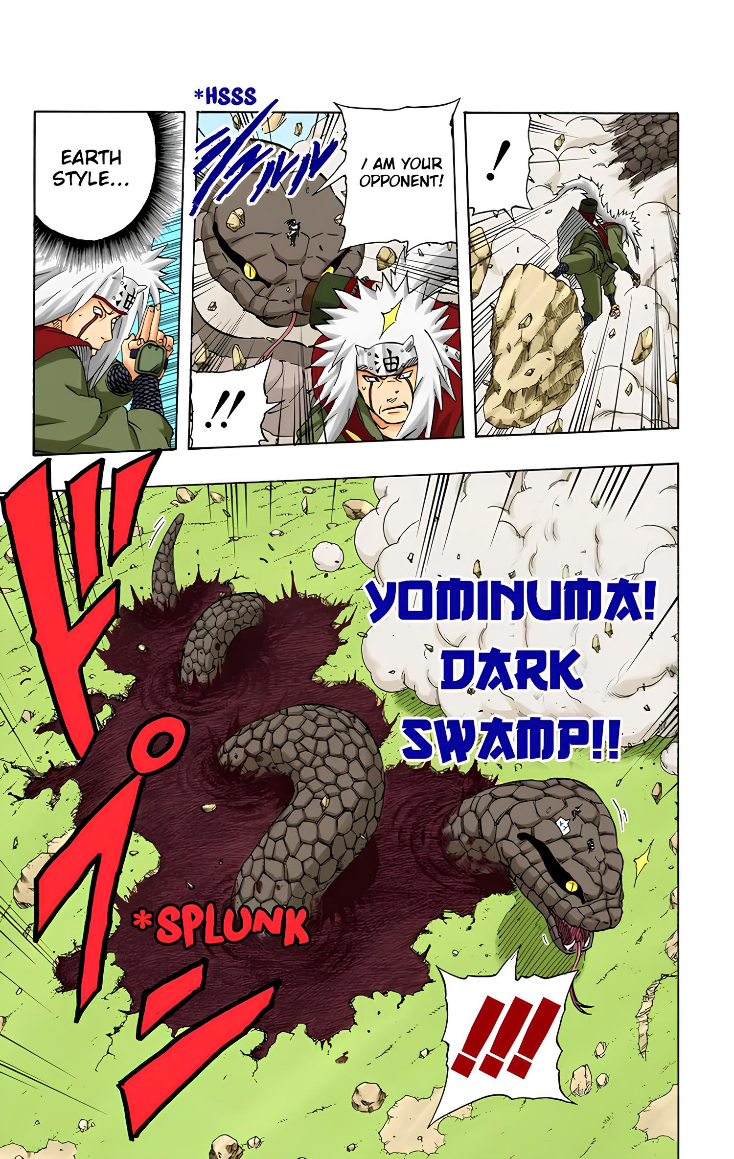 Но это не поможет. Итачи выскакивает (причём, кстати, не факт, что способен на такое расстояние - праймовое АБ Джирайи прямо огромное) и снова тонет в Болотое - Джирайя его перекастовывает. И это ещё если выскочит - под Кавазу Наки или Гамахиро на голову