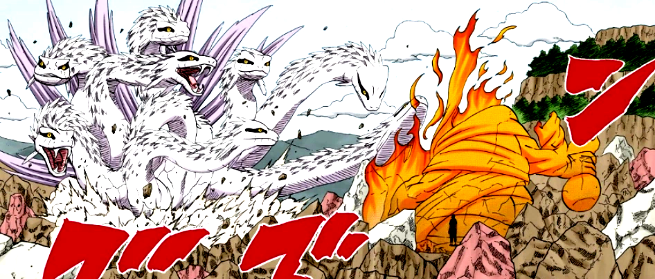 На этот раз давайте возьмём за основу тот домысливый факт, что сила Гидры, возможно, растёт вместе с силами Орочимару - да, это больше похоже на призыв, но складывается ощущение, что Драконий Бог может быть завязан и на самом Орочимару. Как если бы Курама и Наруто, действительно, два разных создания, но уровень второго рос бы через первого, разве что тут наоборот.