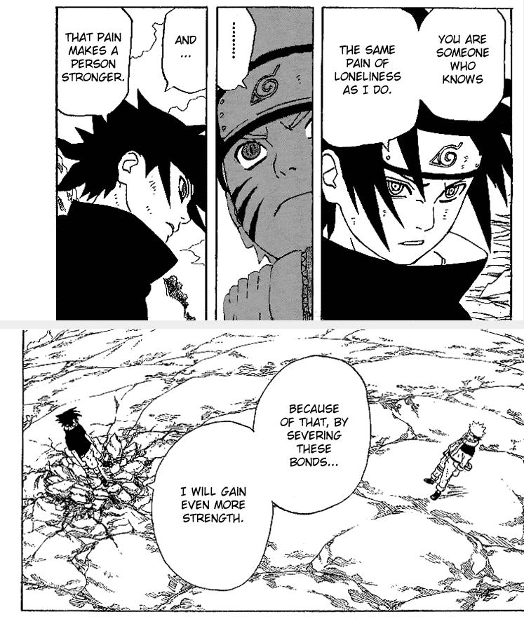 За что ты сражаешься? Ради своих товарищей? Или же ради этого мира? Пойми, однажды друзья отплатят тебе предательством. А этот мир превратит любовь в ненависть.Обито.