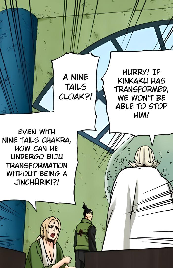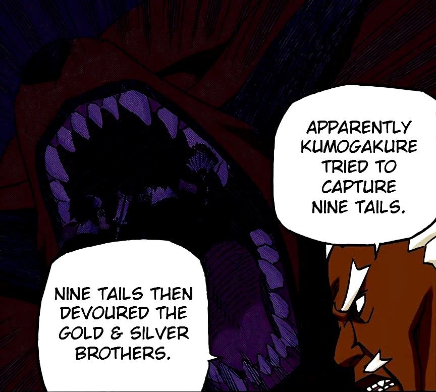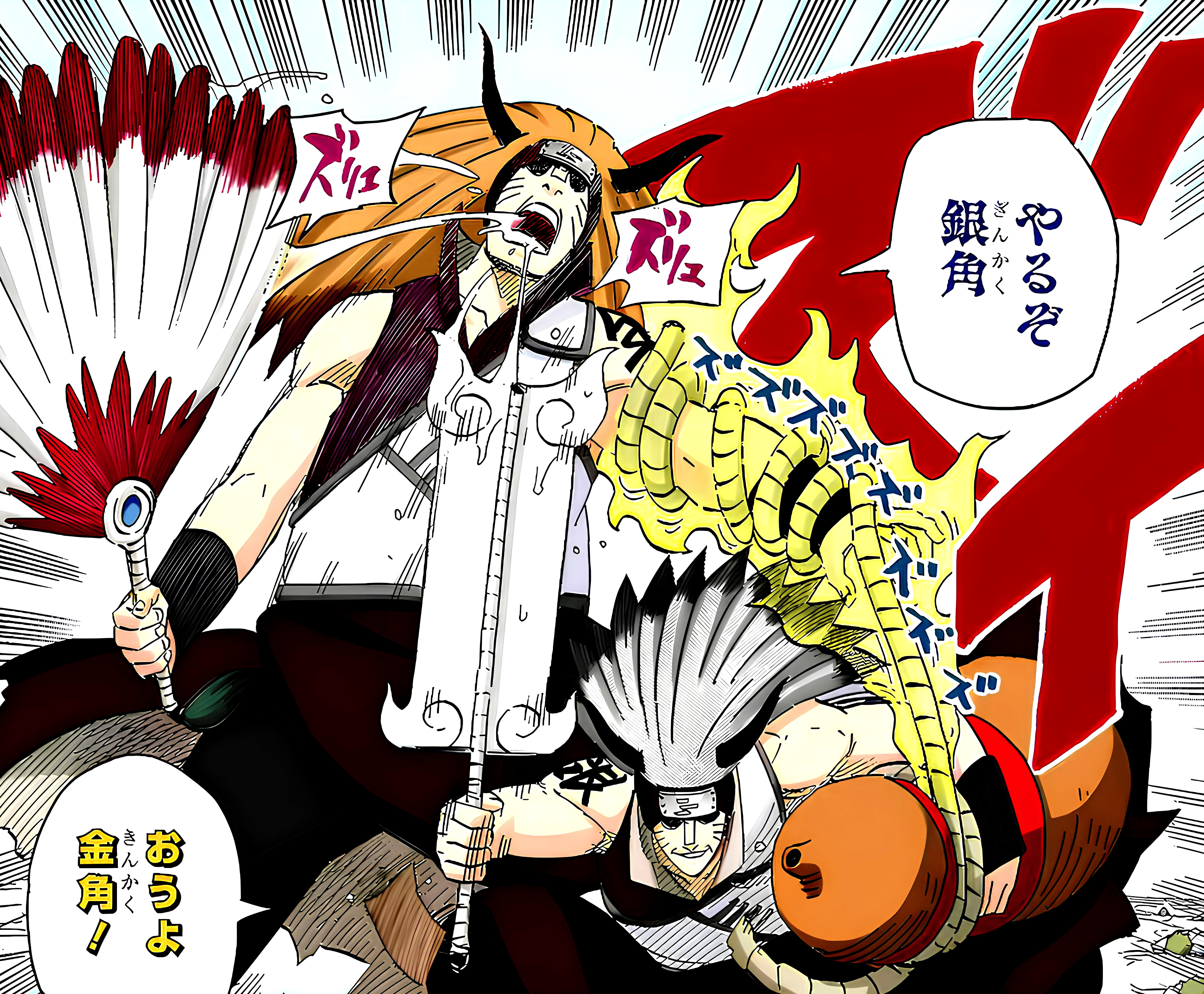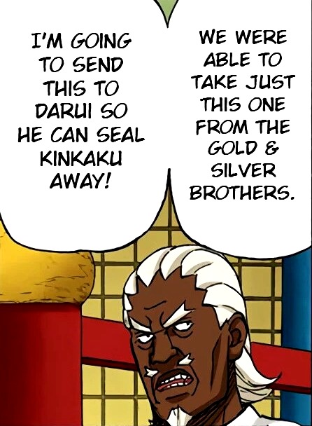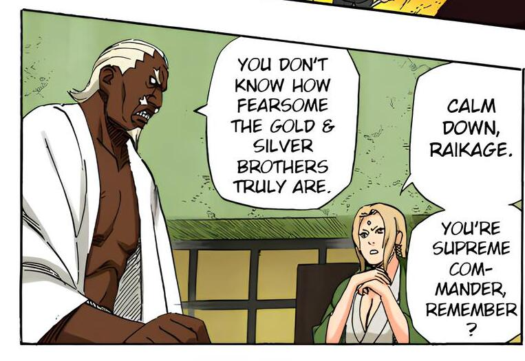 Четвёртый Райкаге заявляет - что он, а значит также Третий Райкаге, бывший джинчуурики Восьмихвостого (как ударная сила деревни) и огромный отряд шиноби Облака ничего не смогли сделать Кинкаку и Гинкаку. Они лишь только отобрали сосуд-горшок Янтарного Очищения.