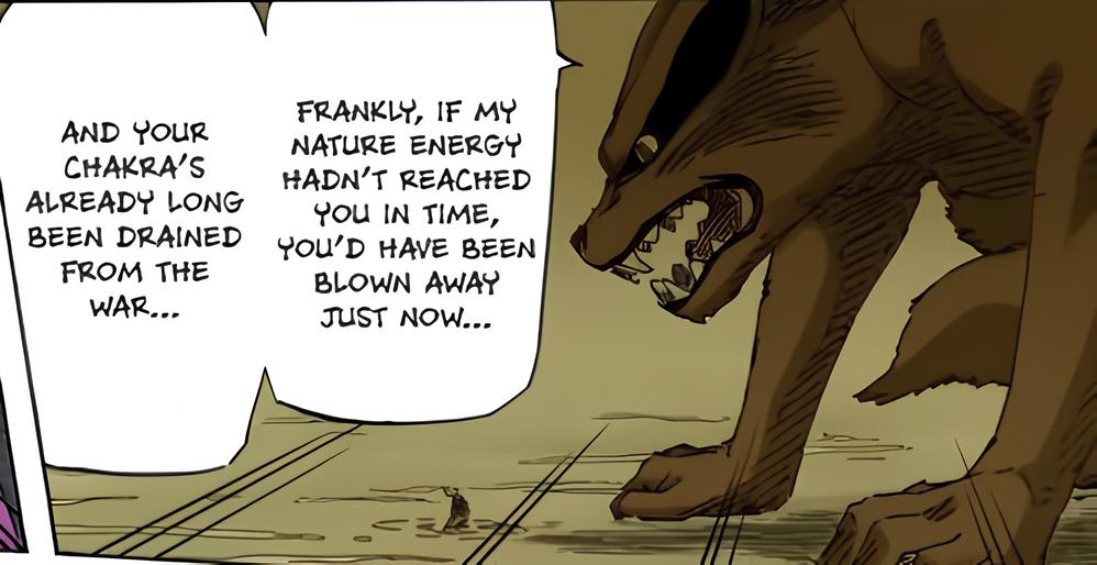 Даже если скромнейше объяснить рояль несулепый тем, что Курама - сам воплощение сенчакры, Десятихвостого, причём самая могущественная, то это ничего не меняет. Быть частью чего-либо - не равно быть равным по качествам и свойствам. В манге Курама, также, никогда раньше не собирал Природную Энергию. А тут вдруг собрал - видимо, потому что Саске в десятки раз сильнее. Ой.