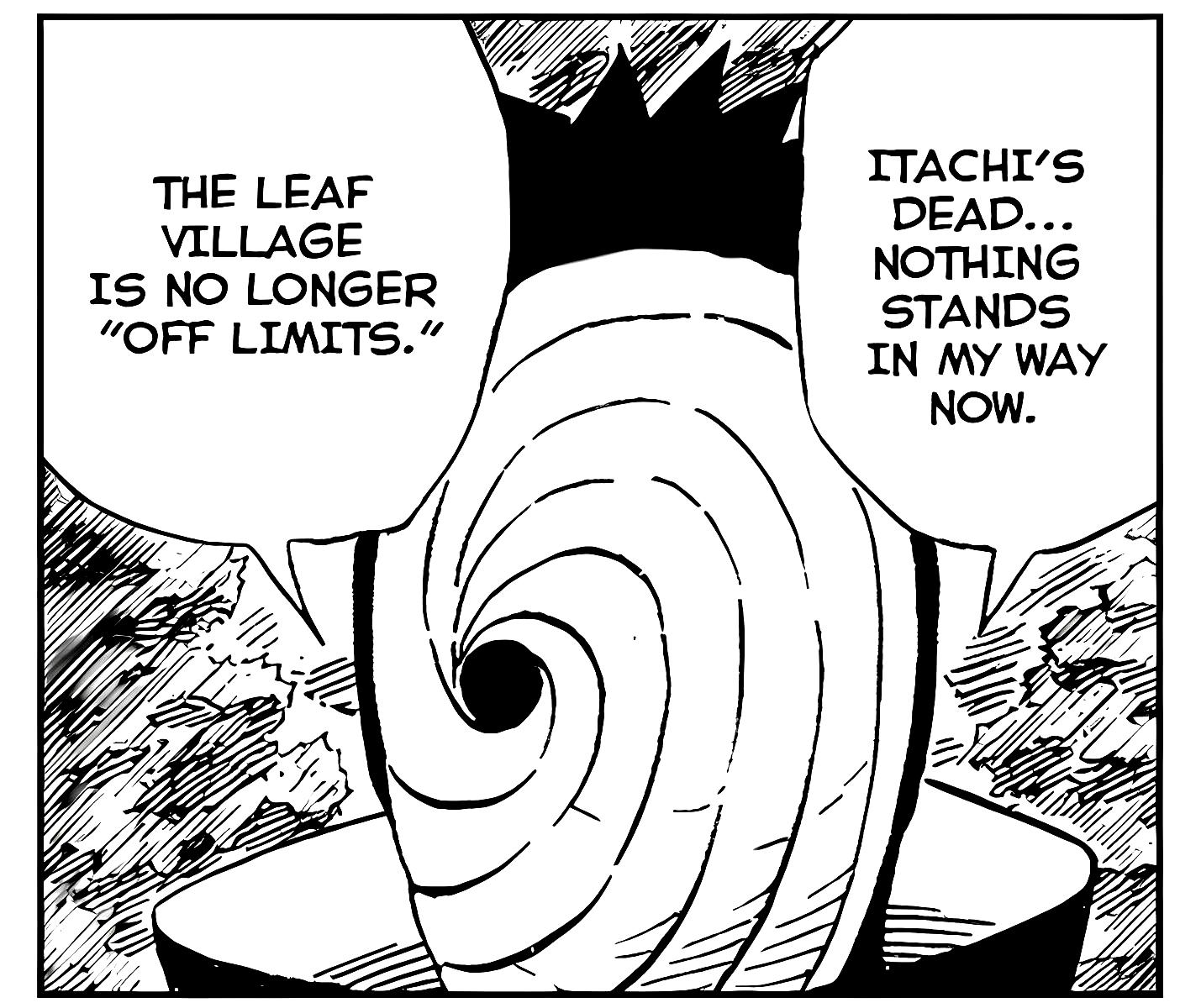 Когда Обито с Зецу на мосту на небольшой прилесной террасе обсуждают планы акацуки и всех участников, которые помогли орге сделать то, что сделали и зайти так далеко, то Обито говорит, в итоге, вспоминая Итачи, что его больше нет в живых и он почтил мир - теперь его отсутствие открывает Ворота перед Конохой - можно смело идти вперёд. Дословно переводя, Коноха больше не "в чёрном списке планов" из-за Итачи.
