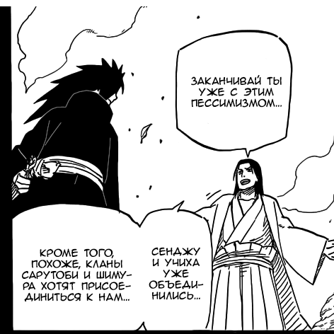 Здесь Мадара и Хаширамы предстают в образах инь и янь, белый и чёрный, то есть мужское и женское начало. Они говорят, что их кланы уже объединились. То есть было кровосмешение. А учитывая контекст их образов, то вполне понятно какое.