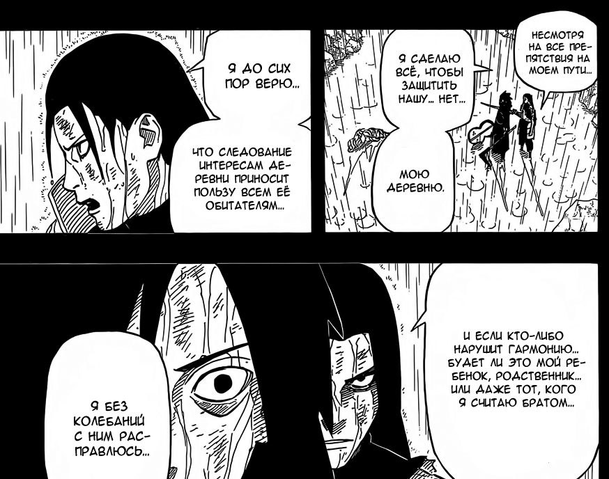 Здесь Хаширама говорит, что готов убить своего самого близкого друга, брата, члена семьи и своё дитя ради защиты деревни. То есть он хочет сказать, что уже сделал это. Мадара был в этот момент беремен их дочерью Кагуей, но ради деревни Хаширама убил одновременно близкого друга, брата, члена семьи и своё родное дитя.