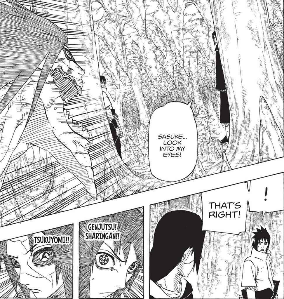 А потом в экстренной ситуации - автор подчёркивает - смерть идёт за Саске и Итачи в виде атаки Кабуто-Орочимару и Итачи с криком просит Саске ему помочь и автор как бы ещё раз демонстративно показывает слабость одного Итачи - Саске с восклицательным знаком говорит - да, я помогу тебе выбраться!