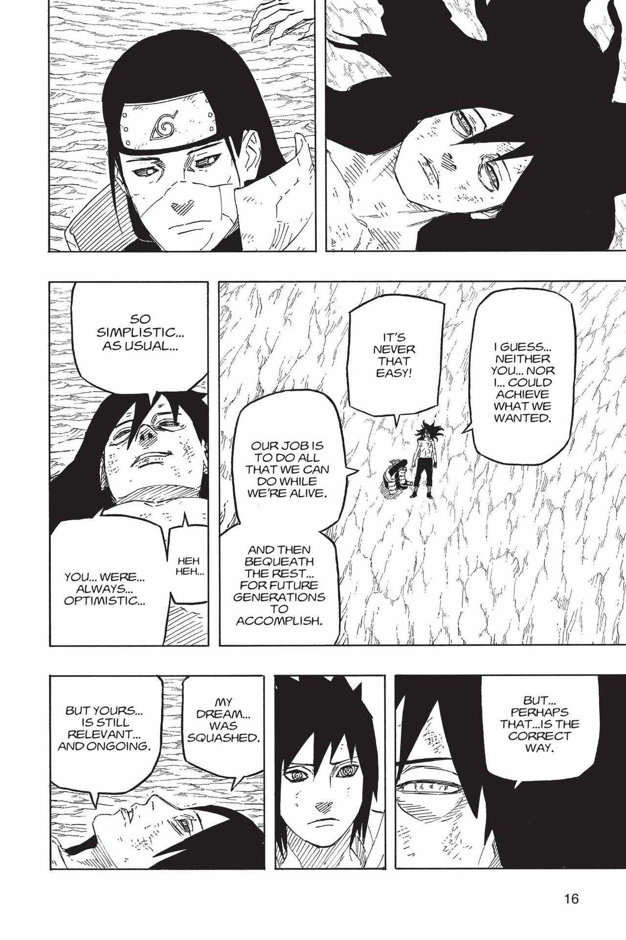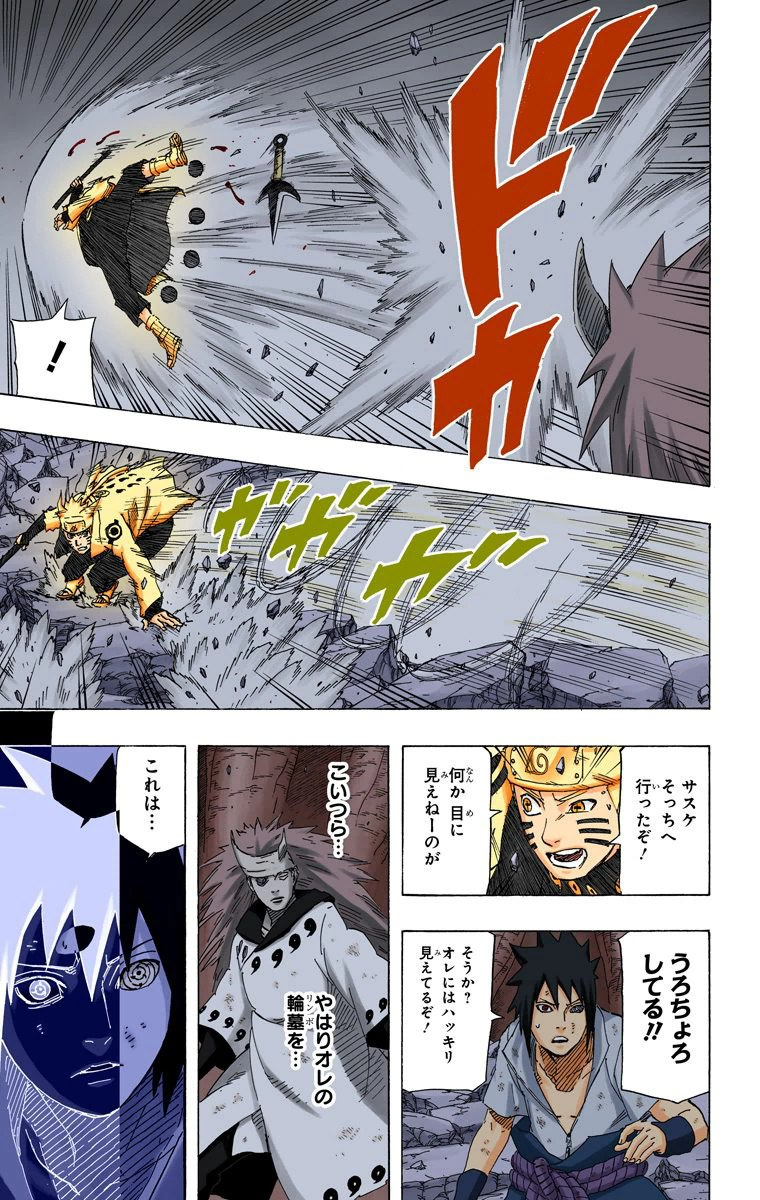Далее зрением Риннегана показываются те моменты о которых говорилось выше, то какую рану оставил удар гудопалкой Наруто на руке лимбо и то, как Лимбо возвращается в тело Мадары сквозь меч Саске. Саске отмечает что чакра шести путей в отличии от остального может воздействовать на лимбо, а затем говорит важную вещь, что лимбо возвращается в тело Мадары после определенного количества времени. Важны здесь слова о том, что лимбо именно возвращается в тело Мадары, что значит оно изначально выходит именно из него, а не просто возникает в определённом месте, тоесть можно сказать, что лимбо появляется в самом теле Мадары и выходит из него, что будет полезно для объяснения ситуации позже. Мадара думает о том, что ему нужно держать в уме что эти двое не ординарные сорванцы и хорошо бы быстрее пойти за своим вторым глазом.