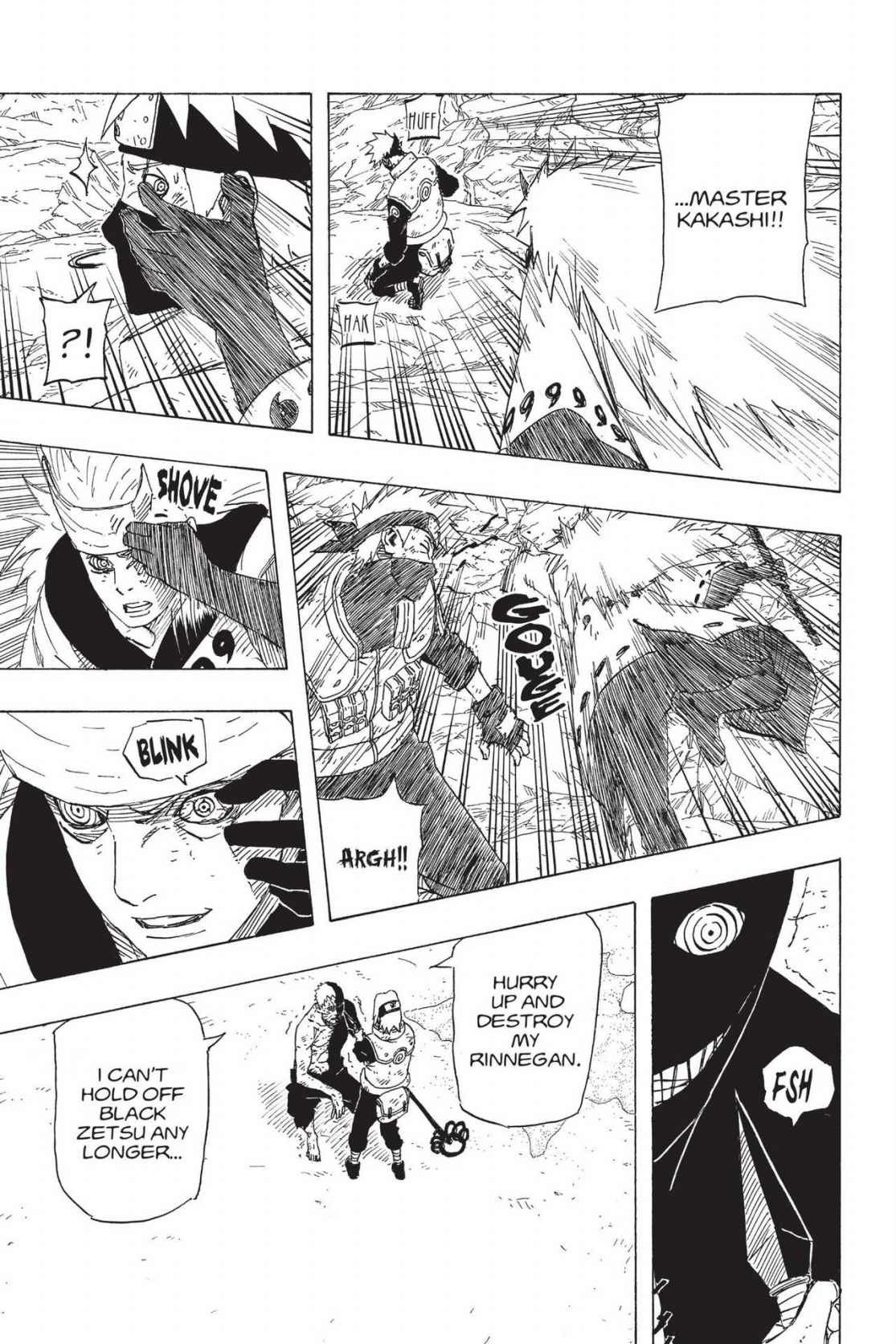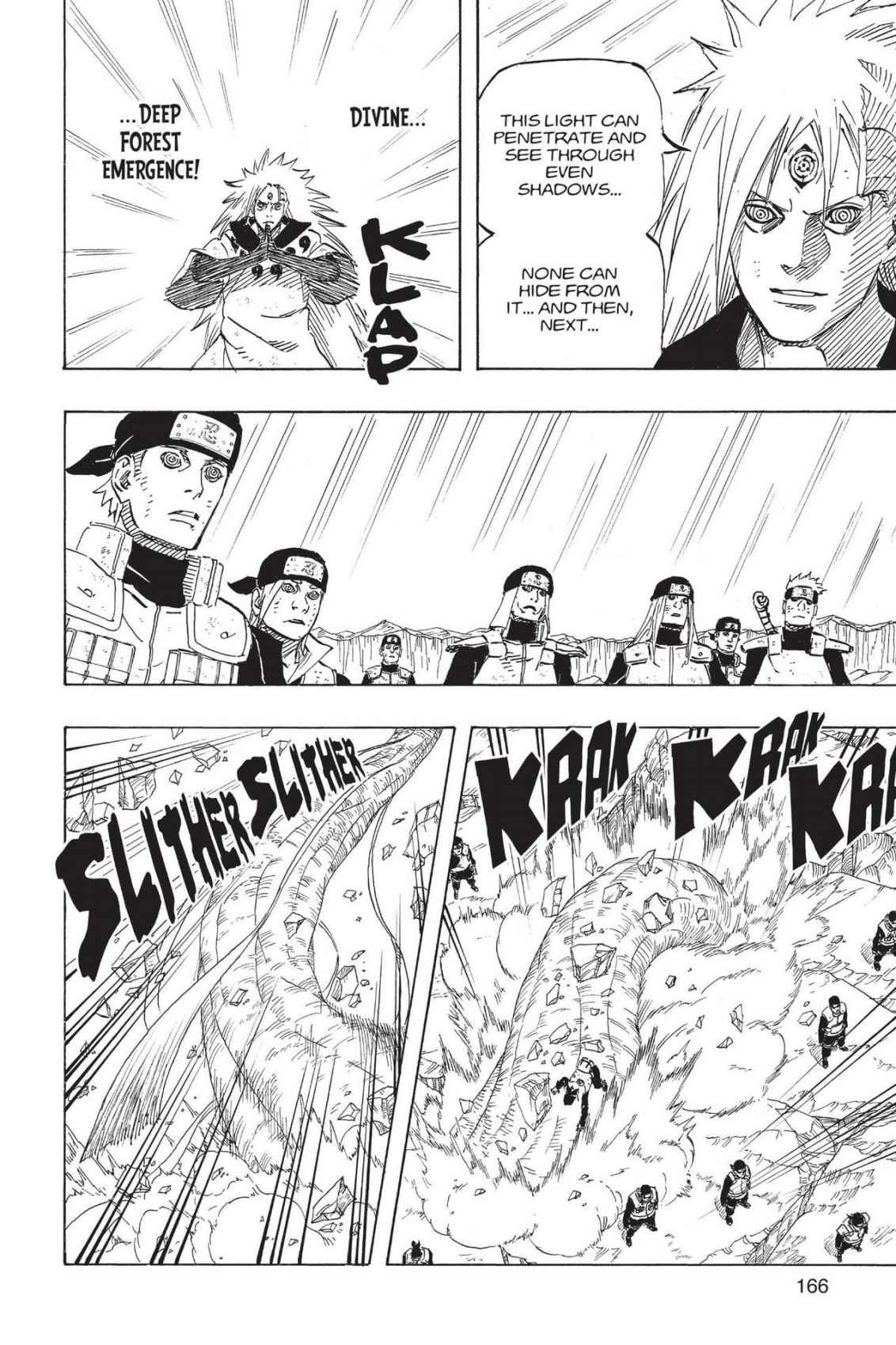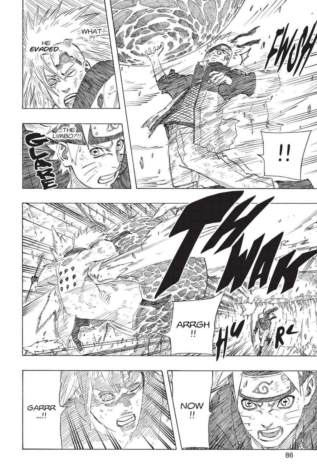 Далее зрением Риннегана показываются те моменты о которых говорилось выше, то какую рану оставил удар гудопалкой Наруто на руке лимбо и то, как Лимбо возвращается в тело Мадары сквозь меч Саске. Саске отмечает что чакра шести путей в отличии от остального может воздействовать на лимбо, а затем говорит важную вещь, что лимбо возвращается в тело Мадары после определенного количества времени. Важны здесь слова о том, что лимбо именно возвращается в тело Мадары, что значит оно изначально выходит именно из него, а не просто возникает в определённом месте, тоесть можно сказать, что лимбо появляется в самом теле Мадары и выходит из него, что будет полезно для объяснения ситуации позже. Мадара думает о том, что ему нужно держать в уме что эти двое не ординарные сорванцы и хорошо бы быстрее пойти за своим вторым глазом.