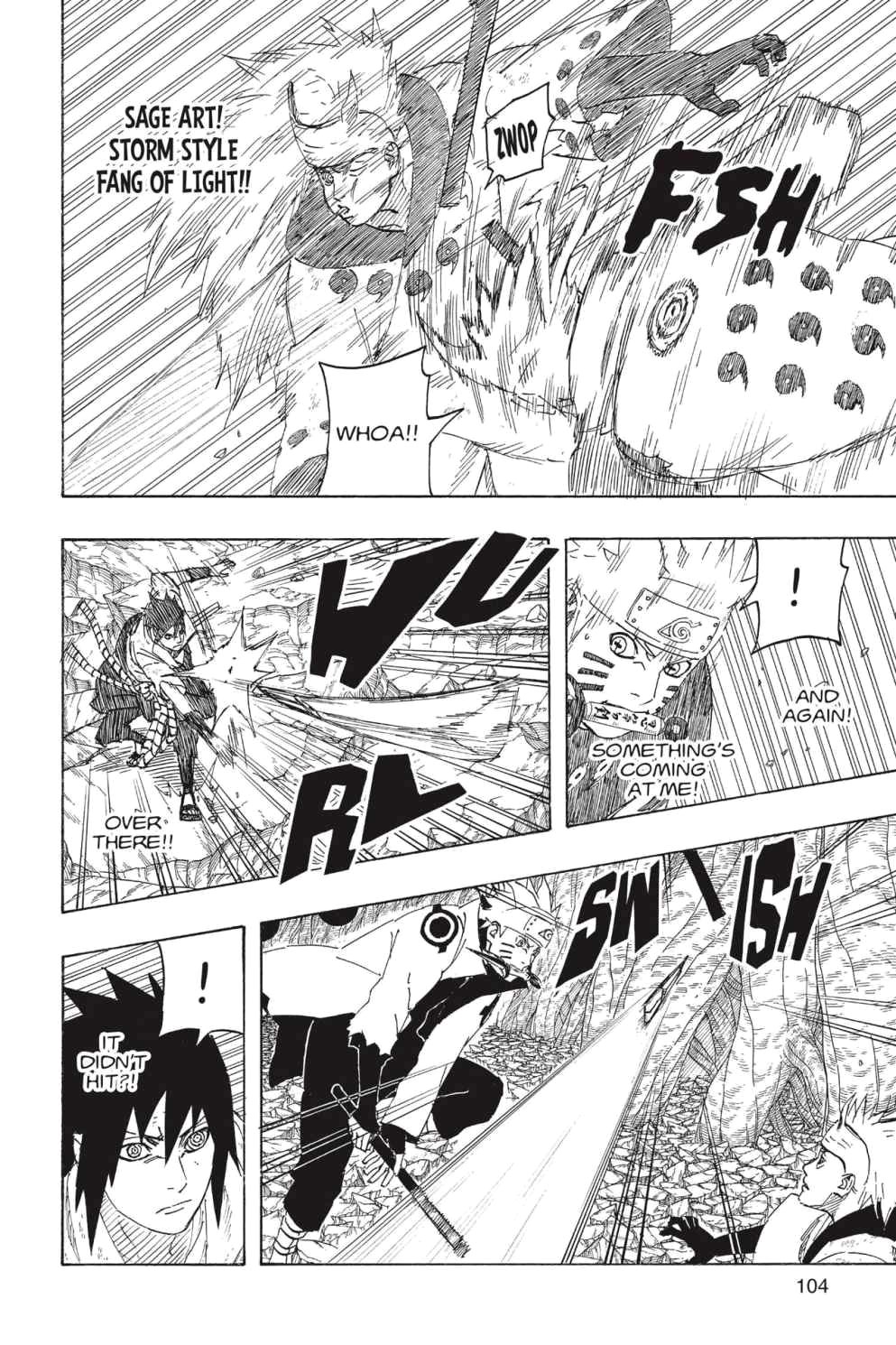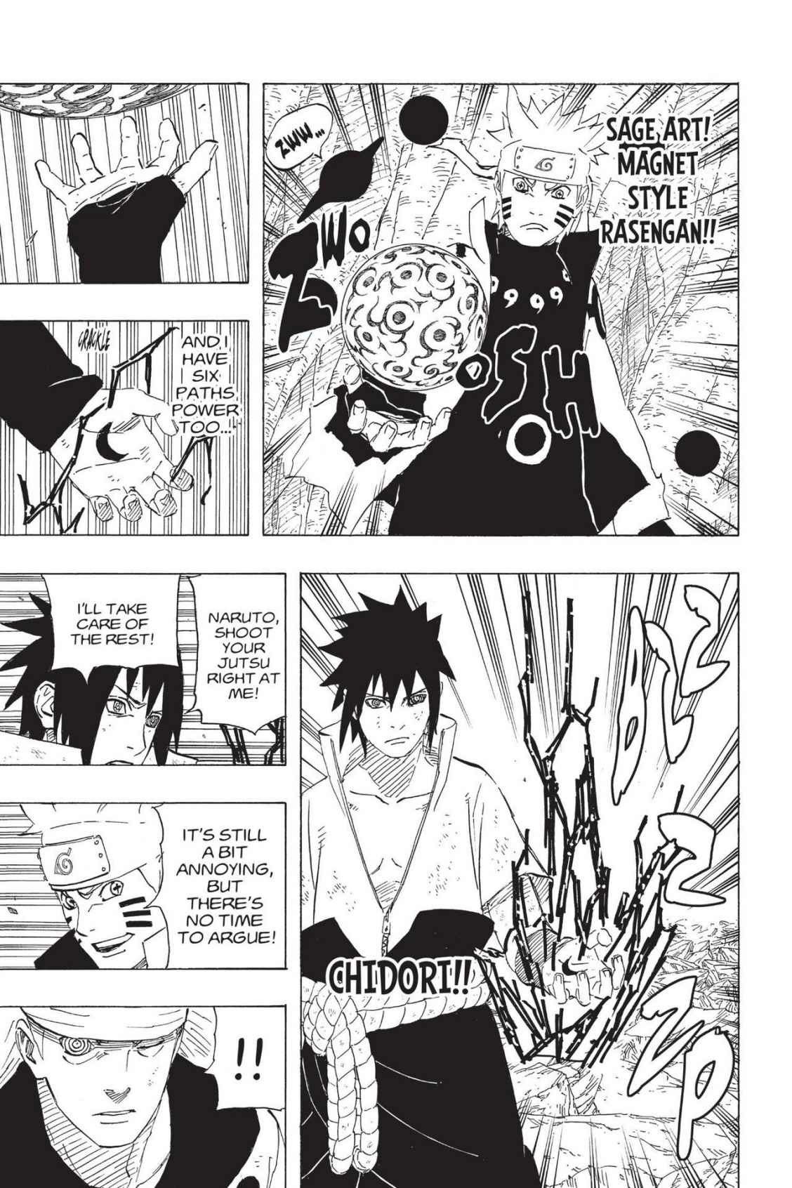 Итак, Наруто и Саске договариваются о плане, Наруто активирует расенган со стихией магнетизма и печатью шукаку, ну и естественно, чакрой мудреца шести путей, Саске говорит что у него тоже есть сила шести путей и активирует чёрное чидори, при чём делает это в руке с меткой на которой сделан акцент на фрейме - связано ли это и если да то как именно неизвестно. Однако такого чёрного чидори как отдельной техники нету в датабуке, так что можно предположить, что это просто чидори, которое с чакрой шести путей становится чёрным. Главные герои затем атакуют навстречу друг другу и Саске с помощью АТ подставляет Мадару под удар, здесь важно отметить, что первоначальный удар пришёлся именно по телу самого Мадары, так как на фрейме прямо показано, как удары вминают тело Мадары по бокам с характерными обозначениями ударов и нога Мадары поднимается от удара расенганом в бок, однако, на теле Мадары после этого не остаётся никаких ран, вряд ли расенган Наруто теряет свой урон от добавления запечатывающей техники с чакрой шукаку, также как этого не происходит с расен сюрикенами с чакрами разных хвостатых включая шукаку, и чёрное чидори Саске не является особой техникой без урона с другим воздействием, хотя показано как его молнии позже обхватили тело подобно тому как это делают ветви-молнии с чакрой Инь использованные Мадарой ранее, видимо это такое свойство тёмных молний с инь-чакрой, но по логике пробивной мощи чидори убавлять добавленная сила шести путей не должна, так что вывод - Мадара просто выдержал эти атаки за счёт своей прочности. Постояв под действием этих техник некоторое время, Мадара улетает, оставив на своём месте лимбо, Саске говорит: "Он подставил своё лимбо?" и самым логичным объяснением этой ситуации является то, что как говорилось выше, при активации лимбо сначала появляется в теле Мадары, однако в данном случае Мадара вылетел из лимбо а не наоборот, лимбо из него, при этом лимбо появившись переняло на себя наложенные на Мадару техники и сняло их с самого Мадары. Так что скорее всего это была не особая подмена мест с лимбо, - разве что в рамках одного и того же места, а следствие того что лимбо появляется в Мадаре и может вот так вот перенять на себя наложенные на него печати, а он просто вылететь затем сквозь них, но по идее, Мадара может выкличть технику а зачем включить её снова чтобы повторить такой трюк если это будет нужно. Главные герои замечают улетевшего Мадару уже когда он достаточно далеко, от неожиданности и скорости Мадары.