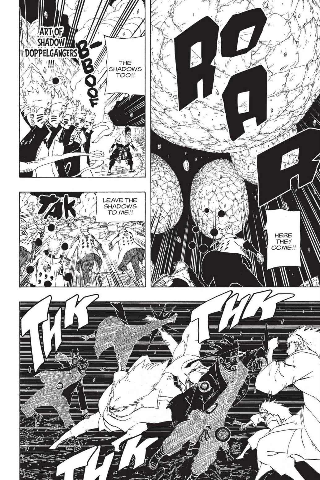 ЧЗ говорит о том что осталось только избавиться от главных героев, тут же Мадара приземляется и говорит, что сейчас он именно это и сделает, Наруто и Саске беспокоятся по поводу того, что они окружены тенями и Мадара говорит, что больше он не позволит им ничего сделать, что звучит так, как будто раньше он позволял им что-то делать намеренно, что сходится с тем, что изначально он говорил о сравнении их сил в последней битве и анализировал способности, увидев большую часть которых он теперь уверенно говорит о том, что расправится с ними, из чего можно сделать вывод, что как минимум по мнению самого Мадары увидевшего способности ГГ, он сильнее их