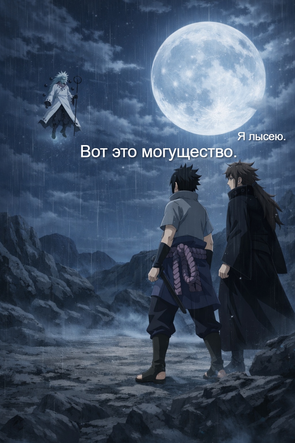 Тем временем Мадара уже мог полететь за Какаши который сидел отдельно, забрать его МШ также быстро как он это сделал позже и пойти за своим Риннеганом в измерение Обито, и уже накладывать МЦ на весь мир, но вместо этого он специально решает подождать ГГ по причинам о которых говорит сам: Чтобы в последней битве выяснить кто из них превосходнее и для себя оценить их силы.